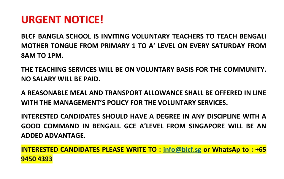 | 19 | 2022-03-21 | INVITING TEACHERS FOR BENGALI TUITION - SINGAPORE CITIZENS & PR |